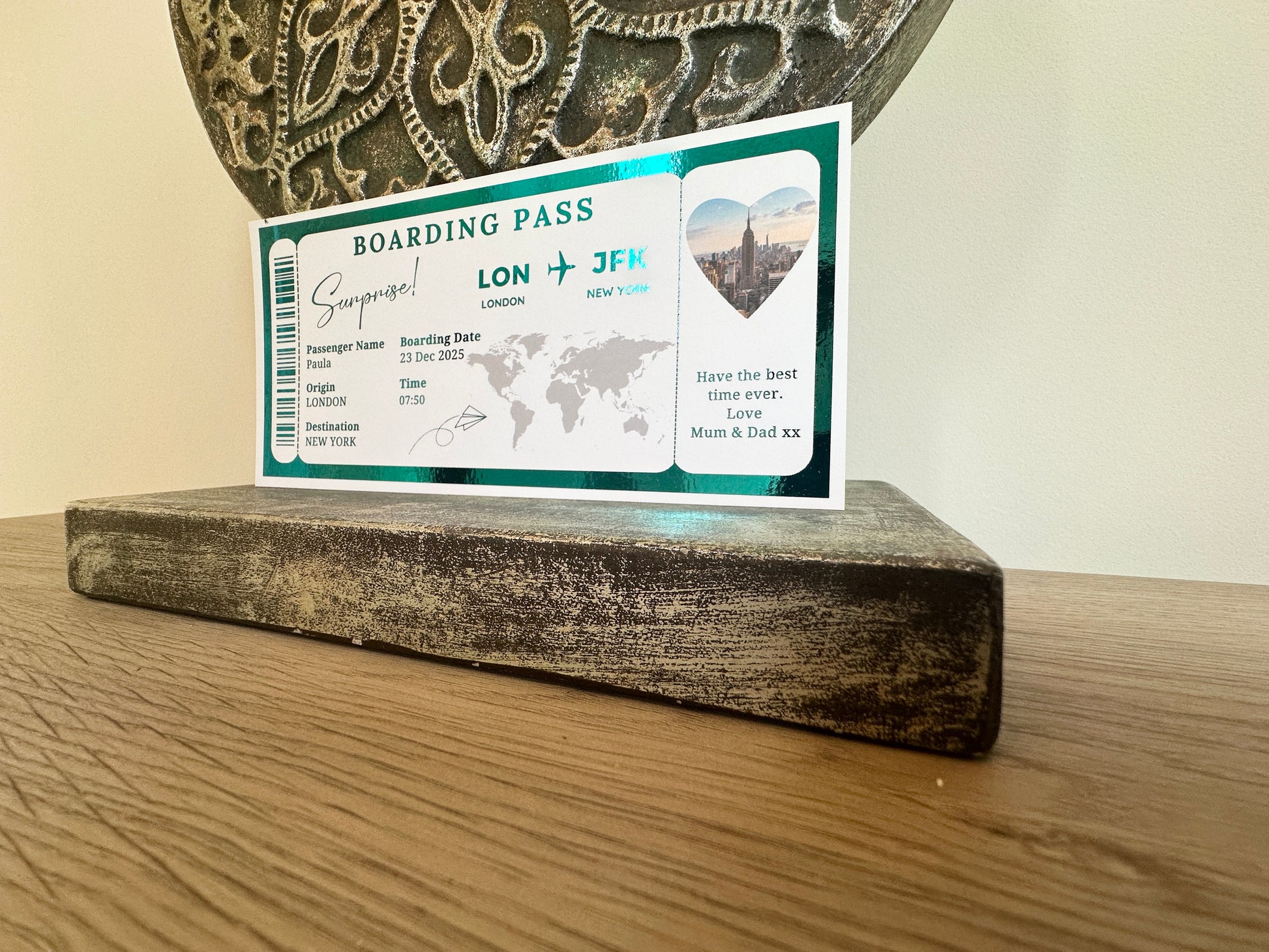 The days of printing off an email confirmation and putting it in a card are officially over. Our fake boarding passes are a perfect way to announce you have booked a special trip away! Each boarding pass is handmade to order and includes your personal information, a gift message and a foiled image of the destination. Whether it is a city break, or a once in a lifetime trip to Disneyland, we can create a foil ticket to suit the occasion.