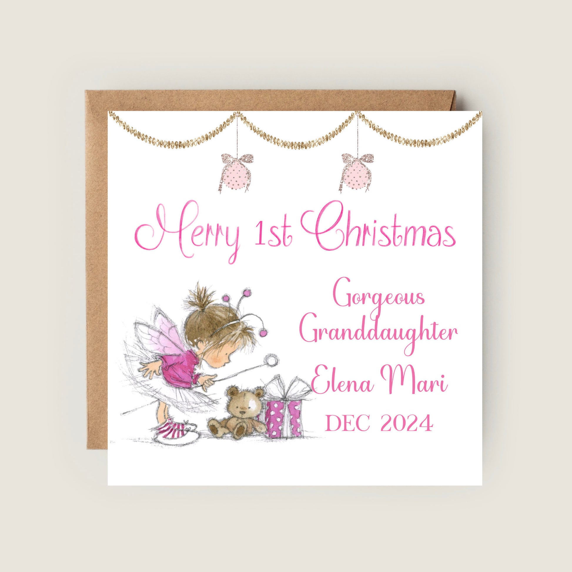 Personalised 1st Christmas Card for Granddaughter, Daughter, Niece, Little Girl with Name and Festive Design