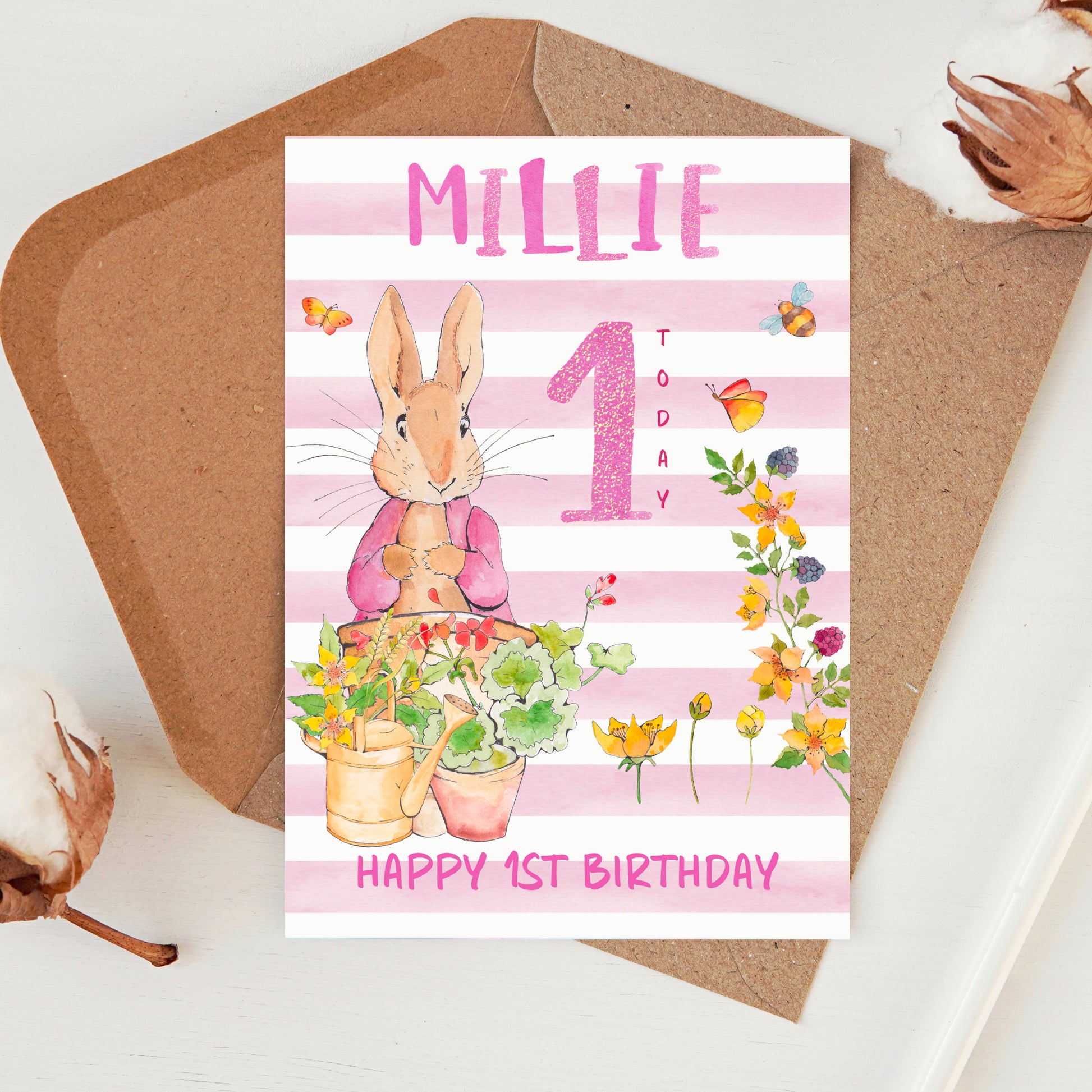Stunning keepsake card perfect to celebrate child's birthday. This card is personalised as shown in the example with the name of a baby girl.